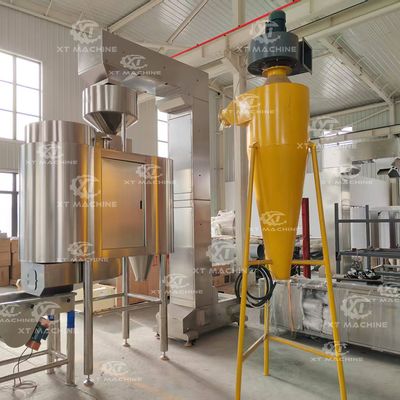 После взвешивания в питателе материал поступает в барабан для шелушения, оснащенный спиральными лопастями. Сжатый воздух подается в барабан для шелушения, заставляя материал перекатываться и тереться внутри спиральных лопастей для достижения эффекта шелушения. Порошок и красная кожица, образующиеся в процессе шелушения, попадают в первичную камеру сбора пыли с потоком воздуха под действием сжатого воздуха. Пыль закручивается и оседает под действием ветра, а красная кожица собирается циклонным сепаратором. Очищенный материал выгружается на вибросито для удаления примесей и получения хорошо очищенного арахиса.